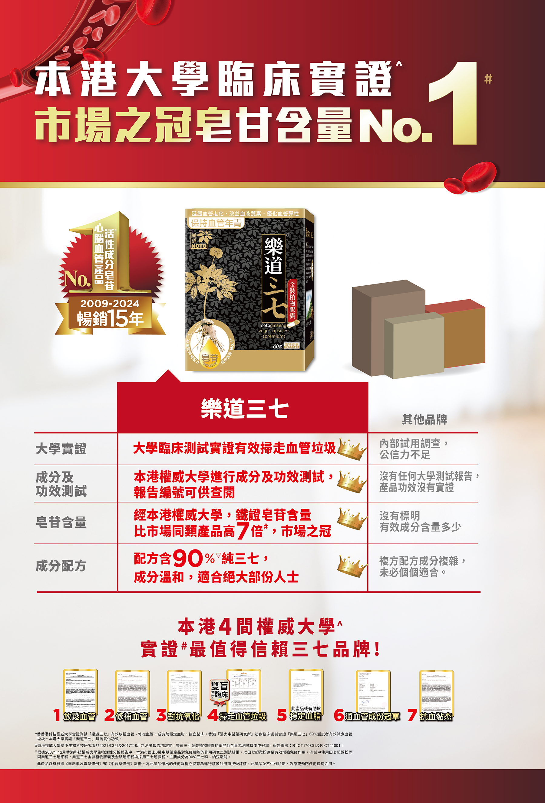 【Noto Ginseng樂道三七震撼價】 新一波疫情可能出現,三高人士在非常時期,更要注意抗三高及心血管健康💪🏼,盡可能降低風險 【樂道三七】最多大學機構實證,抗三高、掃走血管垃圾、強化心血管、抗血黏杰及增強免疫力,暢銷超過10年,信心之選❤️。 金色Noto Ginseng樂道三七金裝植物膠囊60粒 《樂道三七金裝植物膠囊》獲香港中文大學屬下機構香港生物科技研究院測試證實皂苷成份含量為測試樣本中冠軍。 產品含90%三七超細粉,添加納豆激酶優化產品的功效。「三七」除了掃走血管癈物外,同時修補血管損傷。阻止污垢在管腔內沉積; 而納豆激酶善於溶解血管垃圾。全效保護血管,降低三高及心臟風險。 主要成分 90%純三七粉、羥丙甲纖維素、純化水、納豆激酶、膠凝劑(407)、抗結劑(470b) (本產品含有大豆) 主要功能 l 本港雙大學臨床實證,91%減內臟脂肪1 l 69%掃走血管垃圾2 l 或有助穩定血脂、血壓、膽固醇 l 修補及放鬆血管,強化心血管 l 抗三高,保心臟 l 增強免疫力r l 暢銷15年,信心保證 適用人士 關注心腦血管健康人士 生活緊張、工作壓力大 掃走血管廢物 使用方法 每天日間以溫水送服2至4粒, 服用西藥人士,請相隔3至4小時 包裝規格 550 毫克*/粒,共60粒 *重量包括膠囊 產地 香港製造 注意事項 嬰兒、孕婦慎用 嚴重出血症、手術前後請徵詢醫護人員的意見 不代替醫囑 取材天然 – 每批次顏色、質感、味道可能略有不同 儲存方法 置於陰涼乾爽處,避免兒童接觸誤服。 ⚠️包裝以出貨為準 ==⚠️ 聲明 ⚠️== 所有帖文內容只作分享及參考用途。為免混淆視聽,所有商標或版權均屬有關商品品牌商標的持有人,敬請留意。 * 顏色可能會因網頁呈現與拍攝關係產生色差,圖片僅供參考,實物為準。 ^ 外國進口貨品之貨期或受船運/空運延誤影響,恕不接受貨期延誤原因取消訂單,下單前敬請諒解。 # 所有商品說明中提及之最佳有效期僅供參考,時長因應運輸等因素變化,實際以包裝上說明為準。 #acalifemall #保健品 #生活百貨 #特惠價 #家居用品 #家居電器 #保健用品 #瘦身保健品 #防疫快測 #美妝專櫃 #七色花系列 #NMN #美妝護膚#樂道